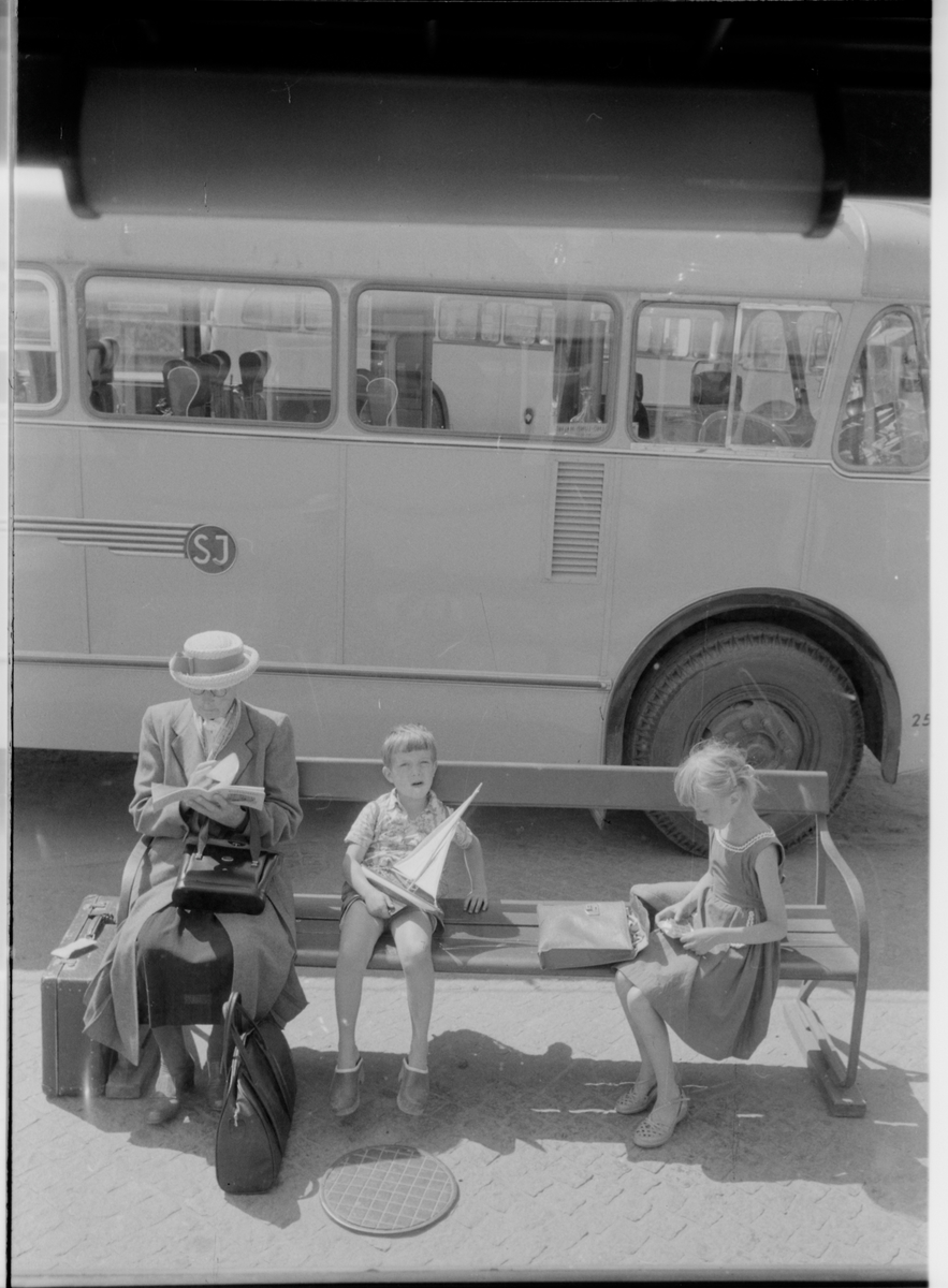 Resande vid busshållplats. Statens Järnvägar, SJ-buss.