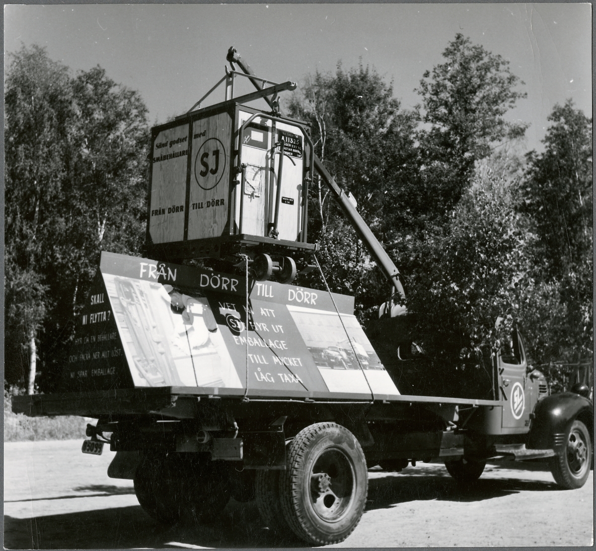 Titel: Svensk Lastbil AB, SLAB lastbil under Barnens Dag i Södertälje med reklam för "Dörr till Dörr".