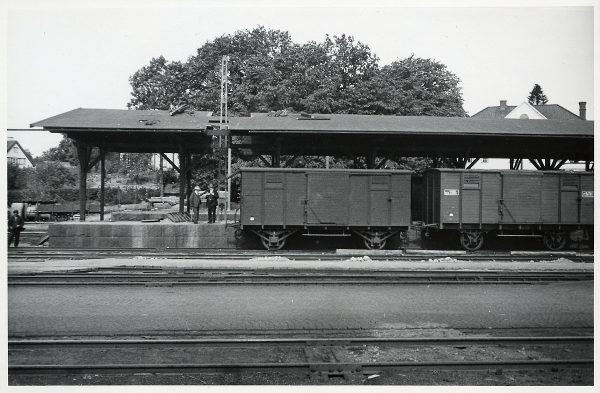 På bilden ses Borås Alvesta Järnvägar, BAJ 251, sluten godsvagn uppställd intill plattformen.