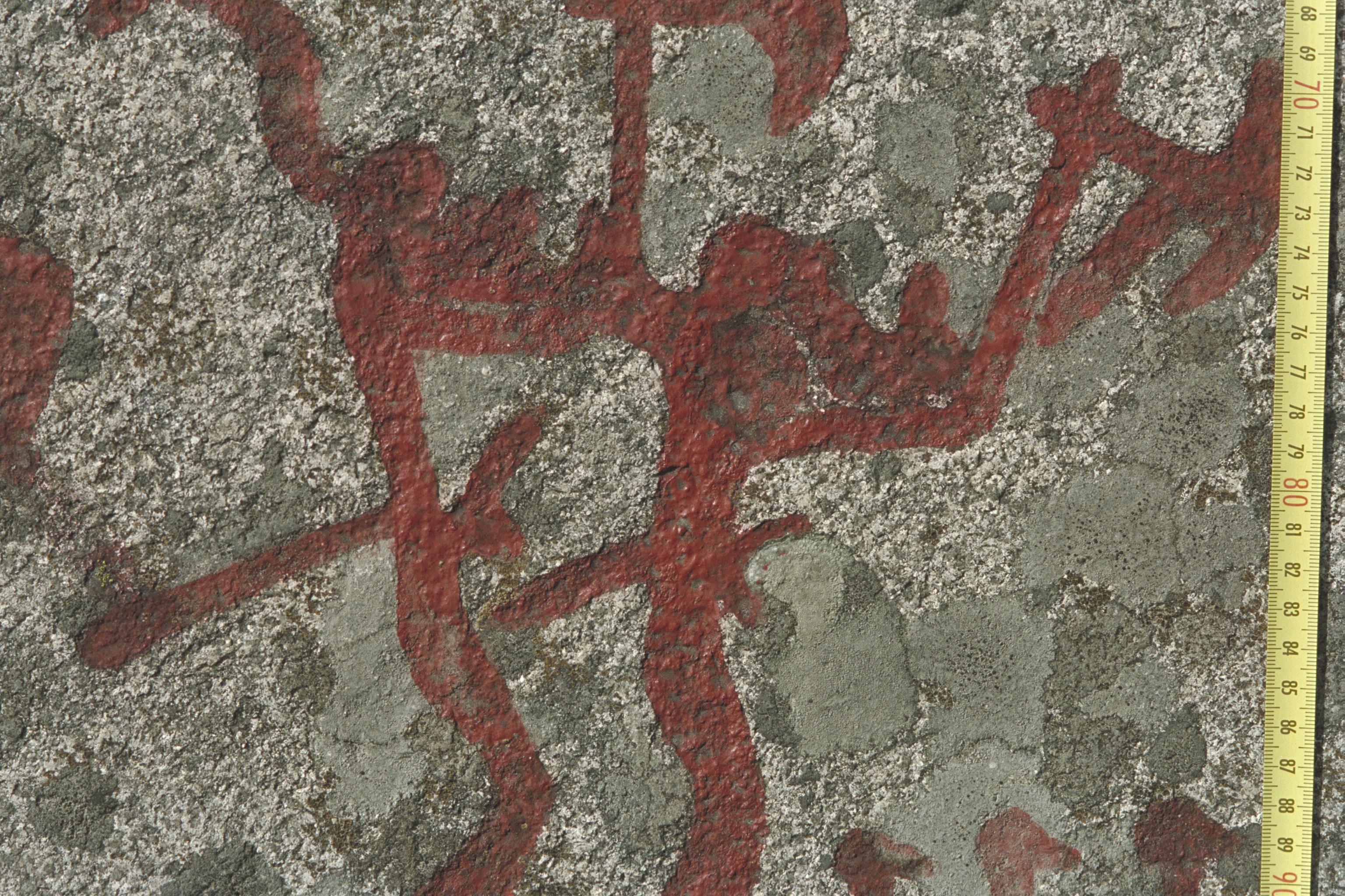 Krigare med svärd och höjda armar hållandes stora ceremoniyxor. Lavbevuxen och måttband. Vitlyckehällen, Tanum 1:1.