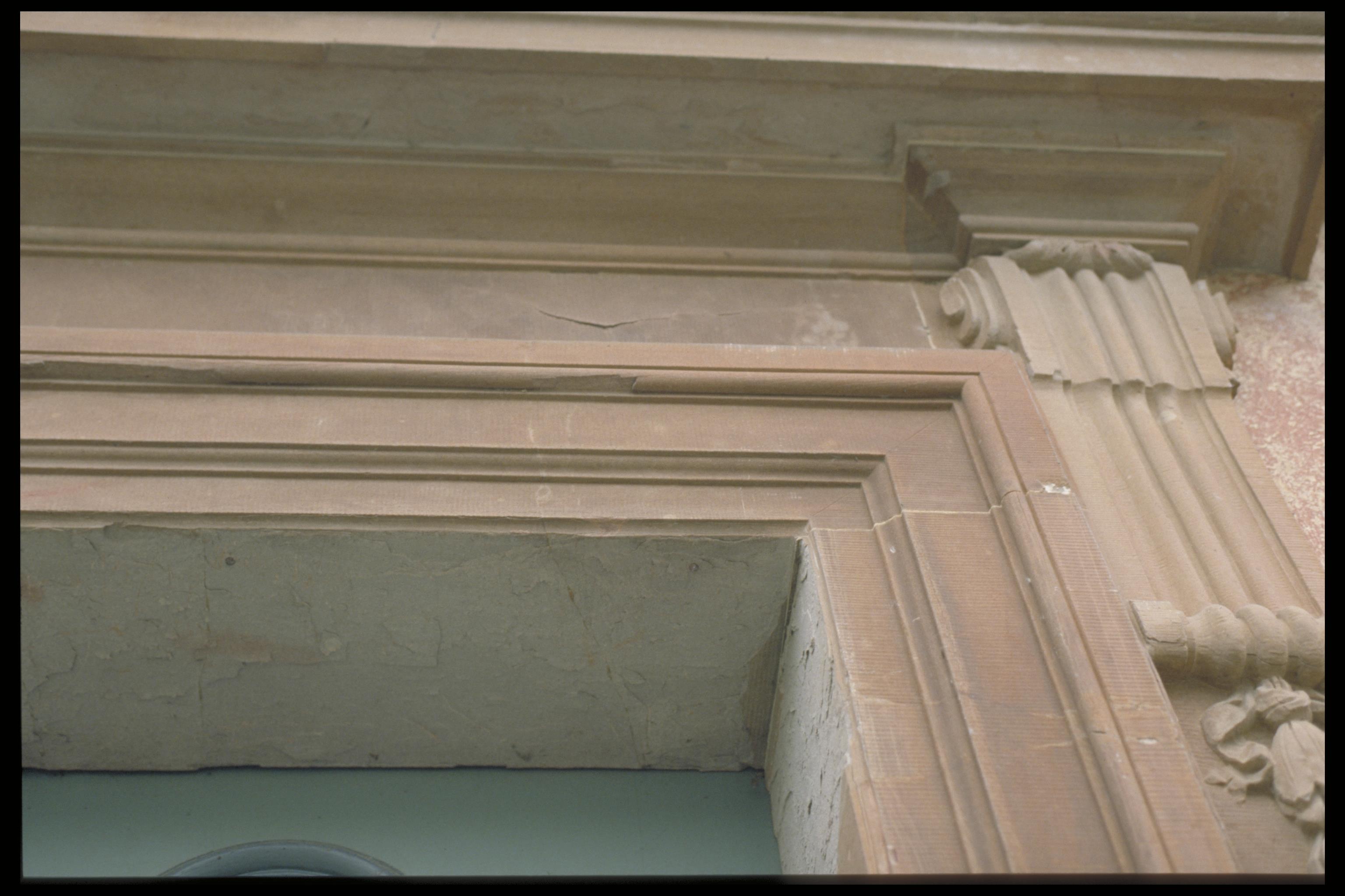 Mangårdsbyggnadens portal vid Övedskloster. Gesims upptill till höger