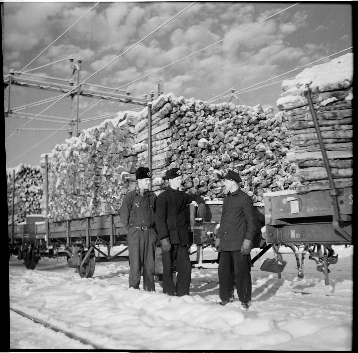 Personal framför lastade godsvagnar.