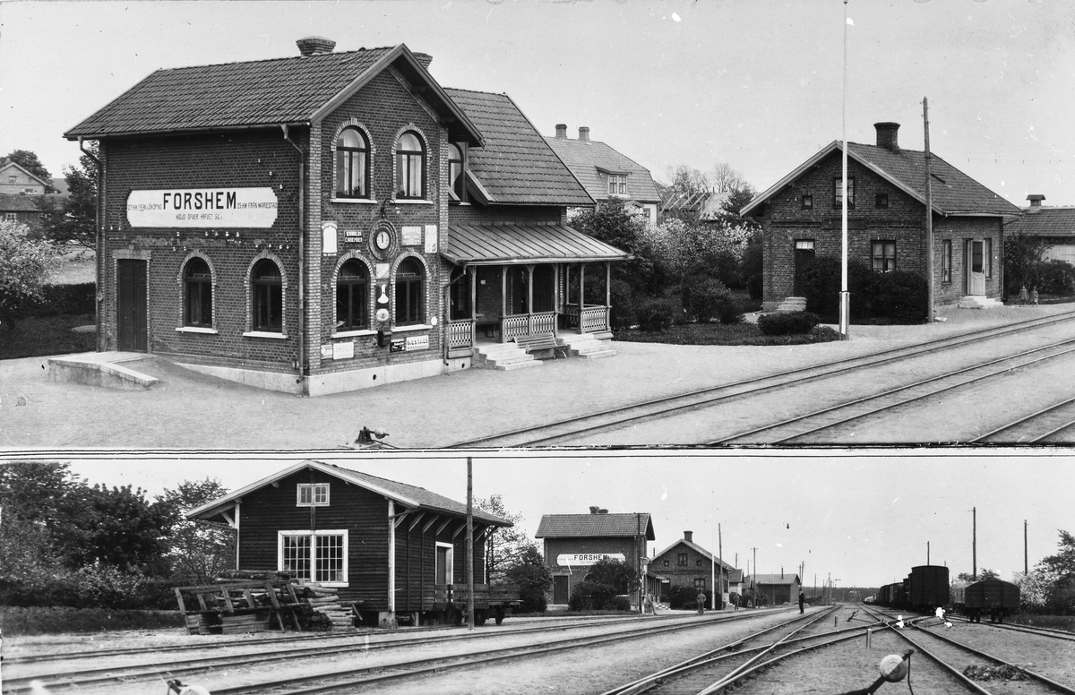 Övre bilden: Till vänster står stationshuset från 1898, till höger syns det ursprungliga stationshuset från 1889.
