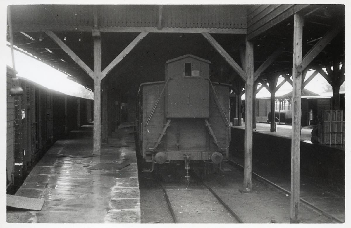 Godsvagn som står inuti godsmagasinet, som är öppet från sidorna.