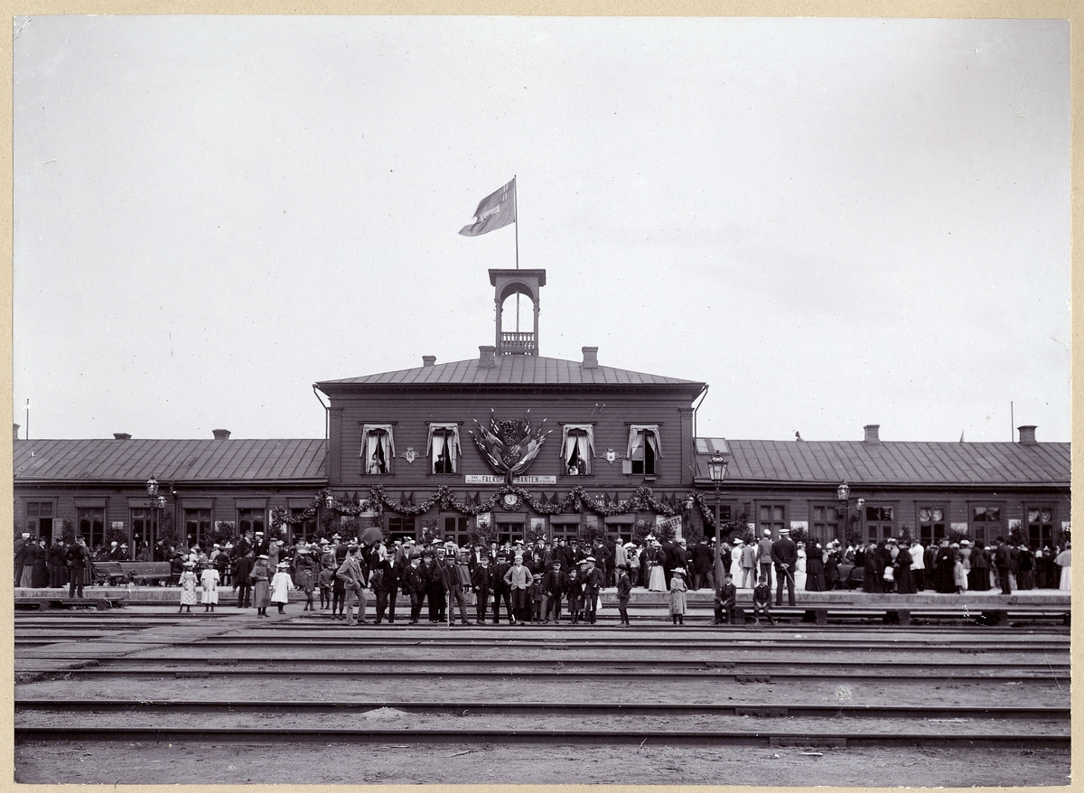 Falköping - Ranten. Stationshuset från spårsidan med mycket folk på perrongen. Huset är festsmyckat. Årtalet 1895 skrivet på baksidan