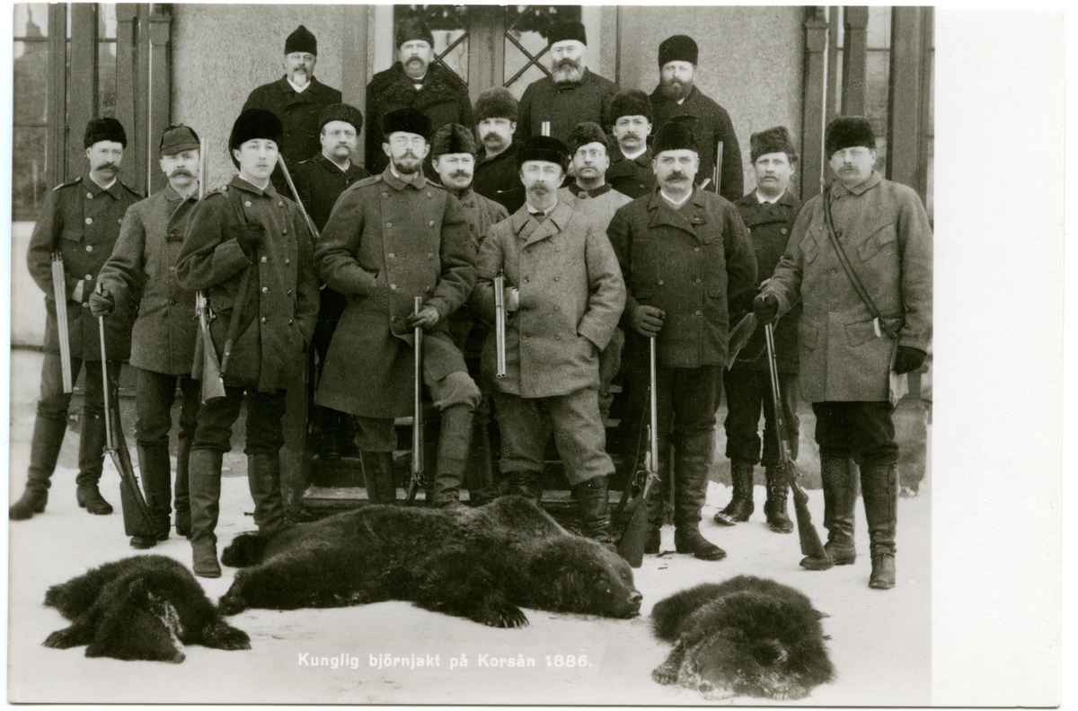 Kungliga björnjägare framför trappan till herrgården vid Korså Bruk.