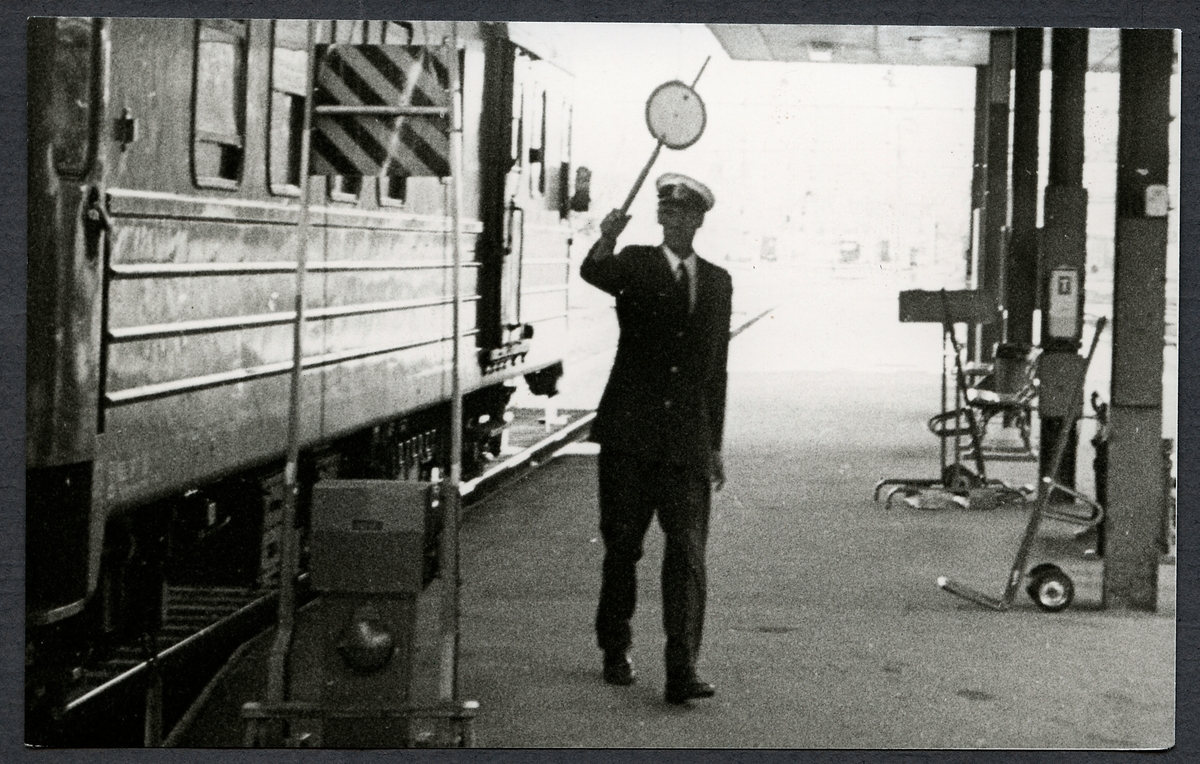 Titel: Tågklarerare ger avgångssignal.