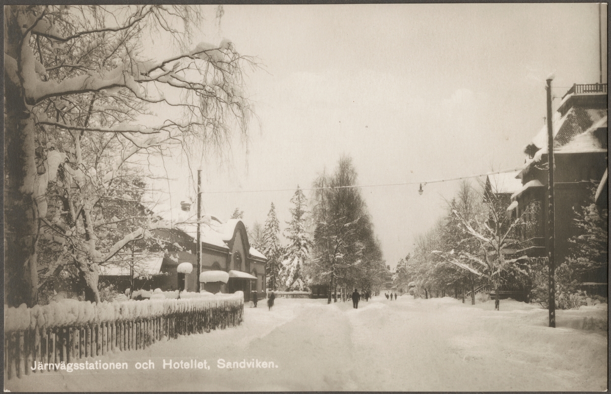 Stadsvy under vintertid med hotell och stationshus i bild.