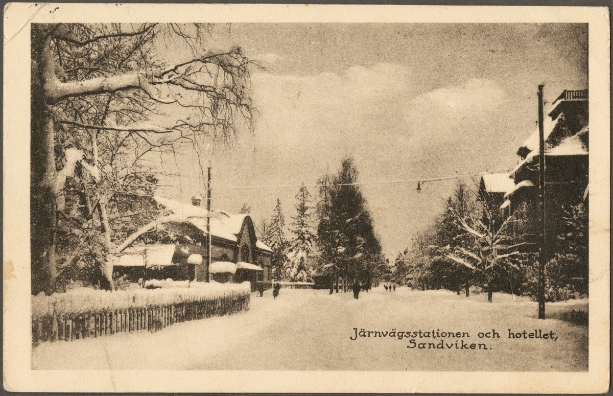 Stadsvy under vintertid med hotell och stationshus i bild.
