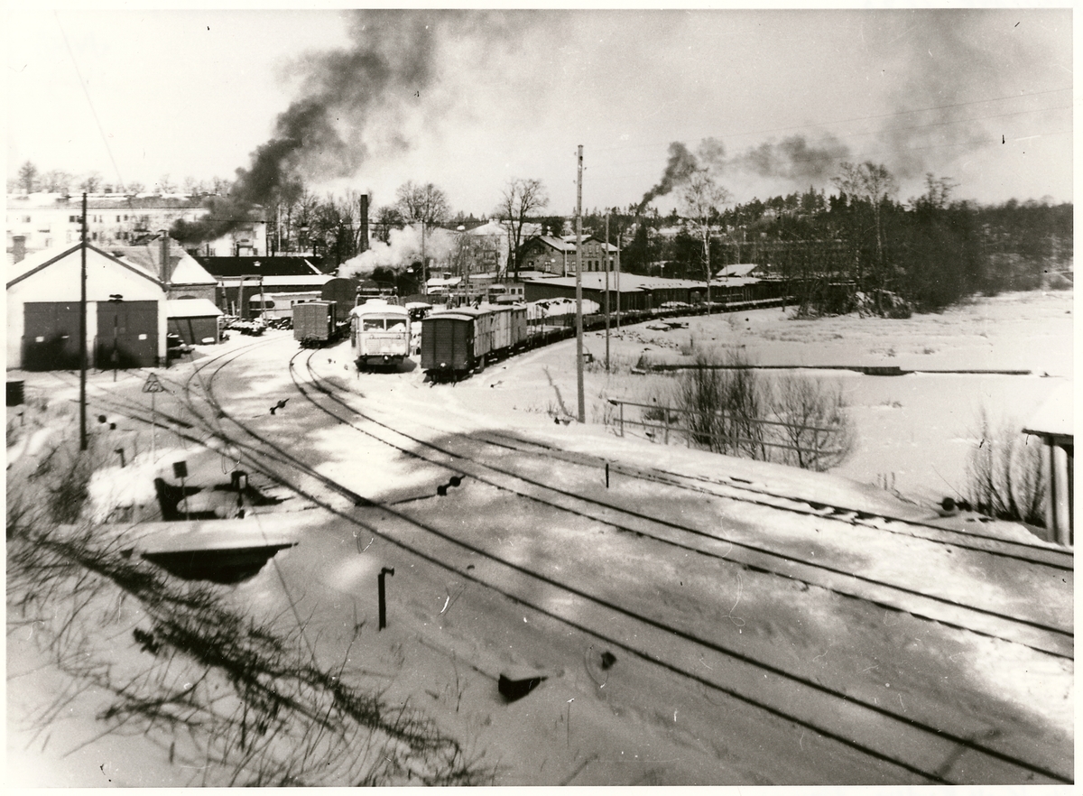 Bangården vid Finspång Station. Rälsbusstallet till vänster.