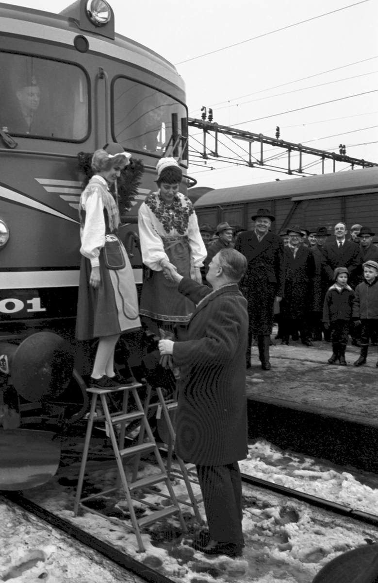 Statens Järnvägar, SJ Rb1 1001, provtur. Kranskullor med Generaldirektör Erik Upmark