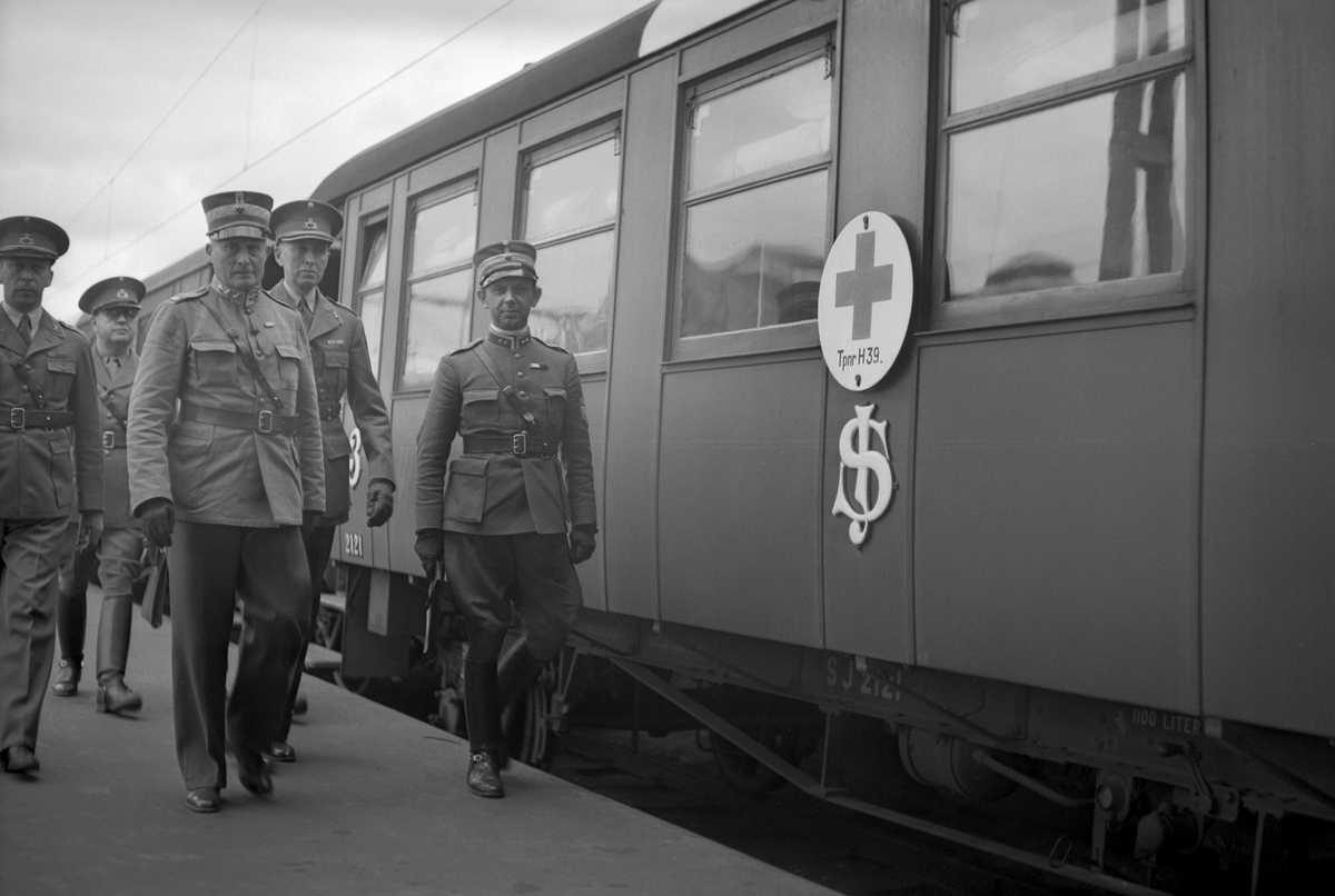 Överbefälhavare OlofThörnell och Överstelöjtnant Henrik Wrede, byråchef för SJ Militärbyrå, inspekterar sjukhuståget H39 som skulle användas till att frakta skadade tyskar från Torneå till Oslo.