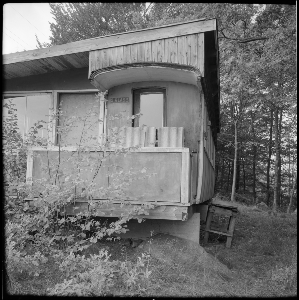 Personvagn 2:a klass ombyggd till en variant av bostad med ett förstärkt tak. Utbyggnad till vänster om vagnen.