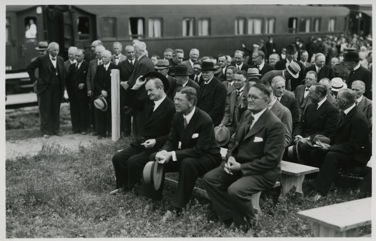 Kronprinsen omgiven av övriga deltagare vid invigningen av inlandsbanan på Kåbdalis station.