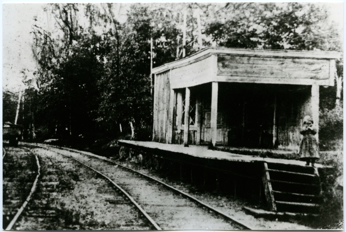 Ludvika hållplats. På trappan prostdottern Gabriella Wahlbäck, född 22 juni 1868. Längst bak i byggnaden fanns ett biljettkontor.
