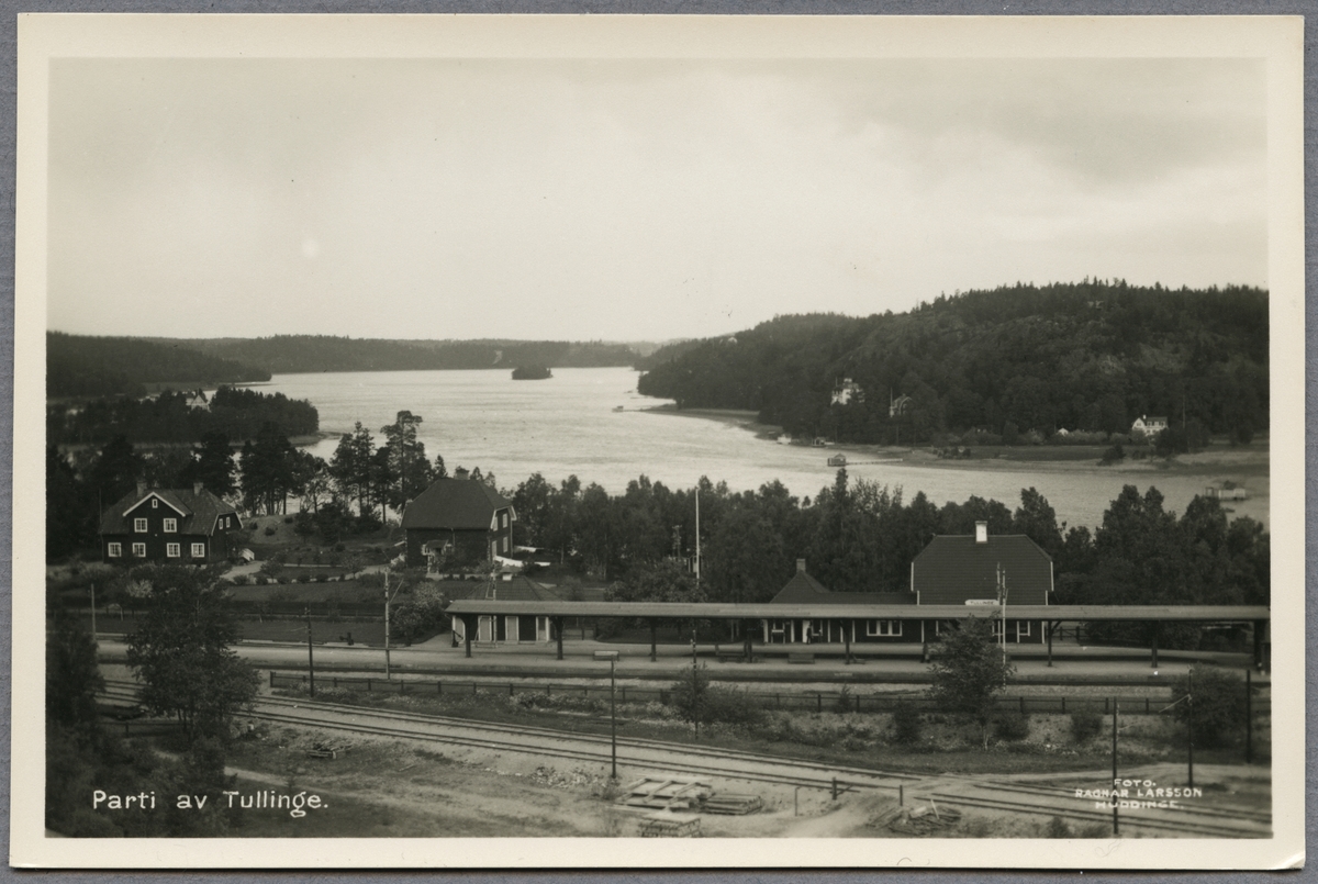 Järnvägsstationen i Tullinge, med Tullingesjön i bakgrunden.