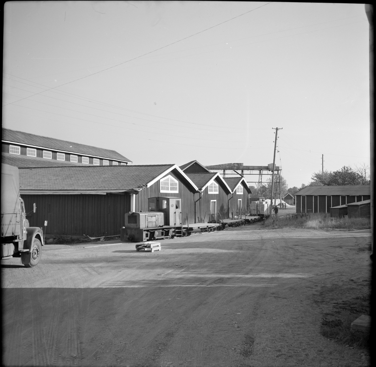 Lokomotor kopplad med fyra godsvagnar utanför fabriksbyggnad.