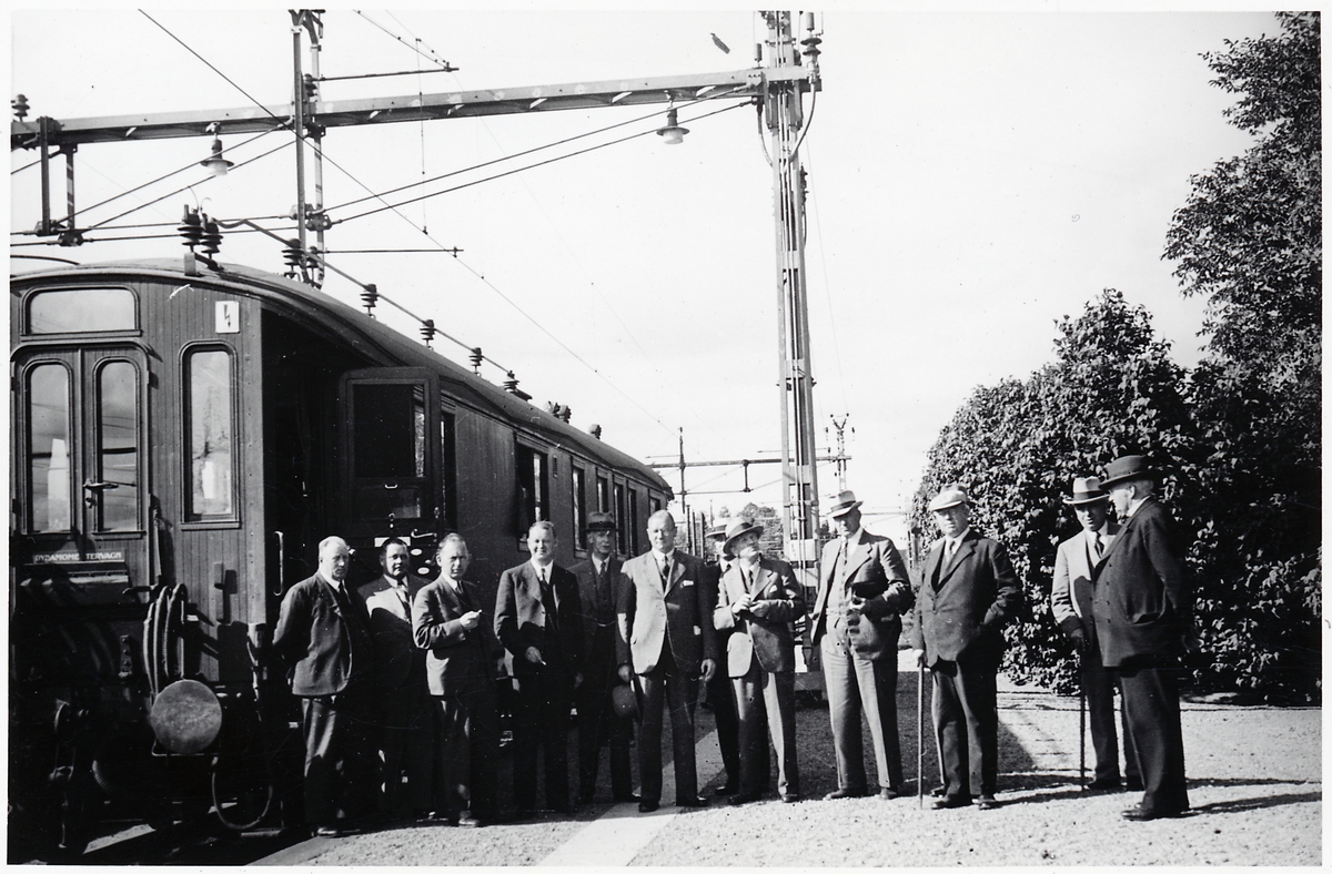 Järnvägstjänstemän fotograferade efter inspektionsresa på Svartåbanan. Vagnen är Statens Järnvägar, SJ B07 2249.
