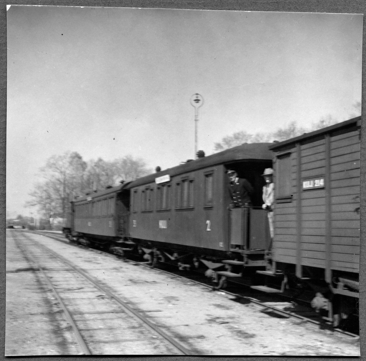 Personvagnar och resegodsvagn tillhörande Köping - Uttersbergs Järnväg, KUJ.