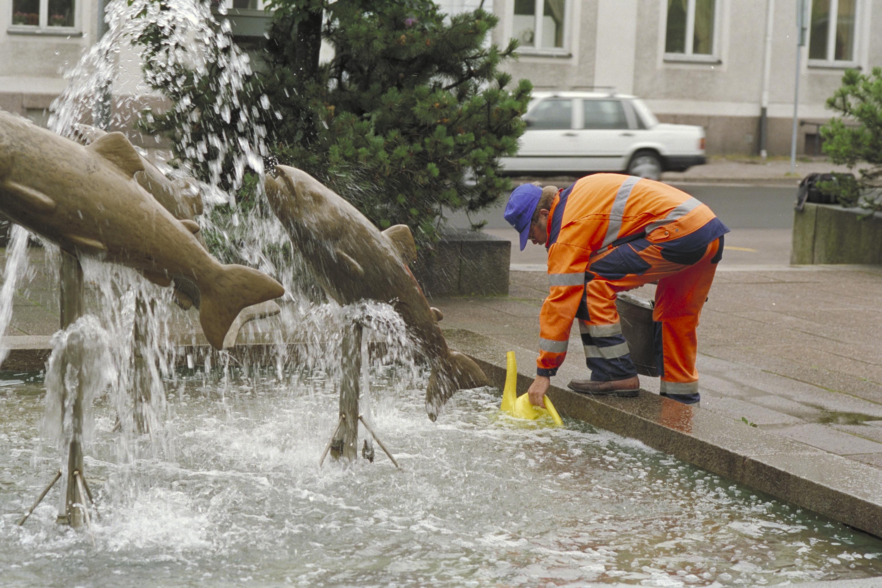 Fontän utanför stadsbiblioteket. Parkförvaltare hämtar vatten i fontänen.