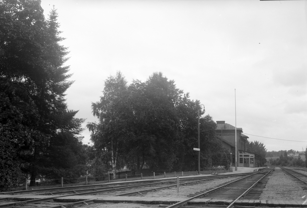 Stationshus i två våningar i sten, med fogstruken mur av rött tegel