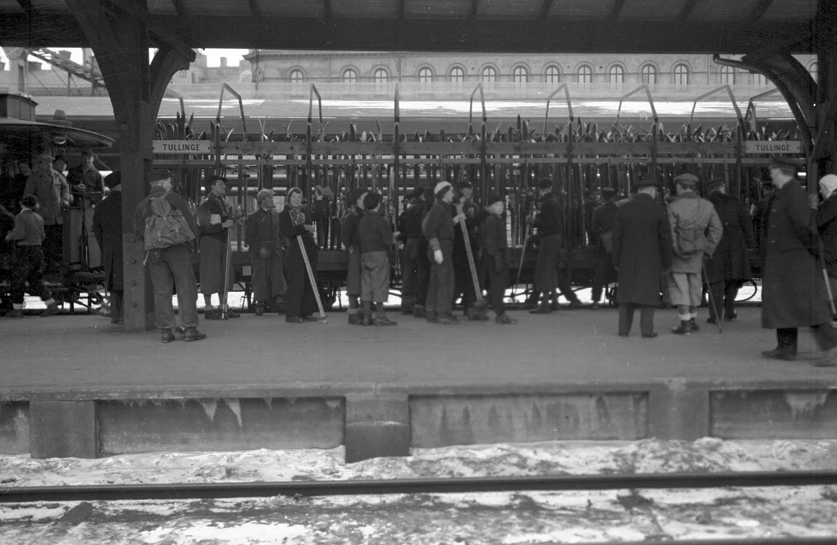 Statens Järnvägar, SJ skidvagn. Resande som ska åka med sporttåget.