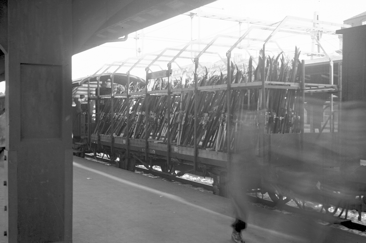 Statens Järnvägar, SJ skidvagn lastad med skidutrustning.