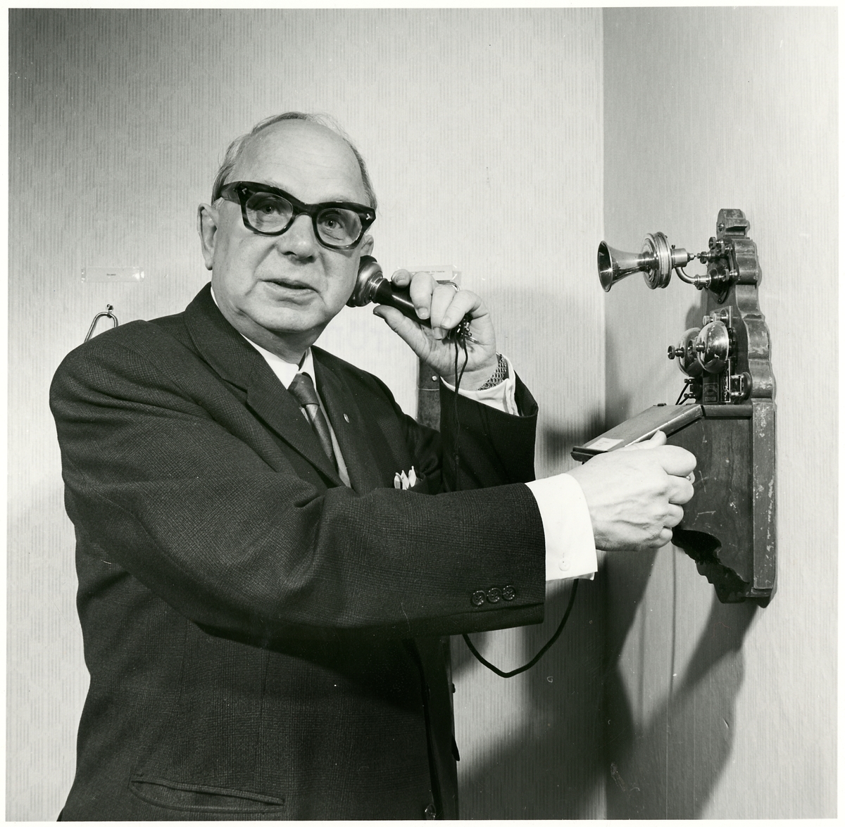 Överinspektör Bo Ytterberg visar upp en av telefonerna som fanns bevarad på det då planerade TGOJ-museet i Skogstorps stationshus.