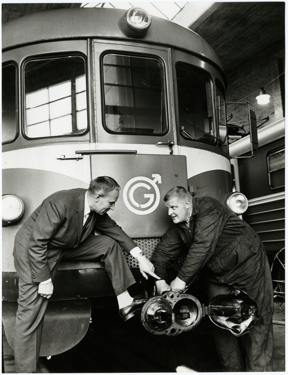 Verkmästare Folke Holmberg och reparatör Bo Elfkvist kontrollerar en koppling vid Trafikaktiebolaget Grängesberg - Oxelösunds Järnvägar, TGOJ verkstad i Eskilstuna.