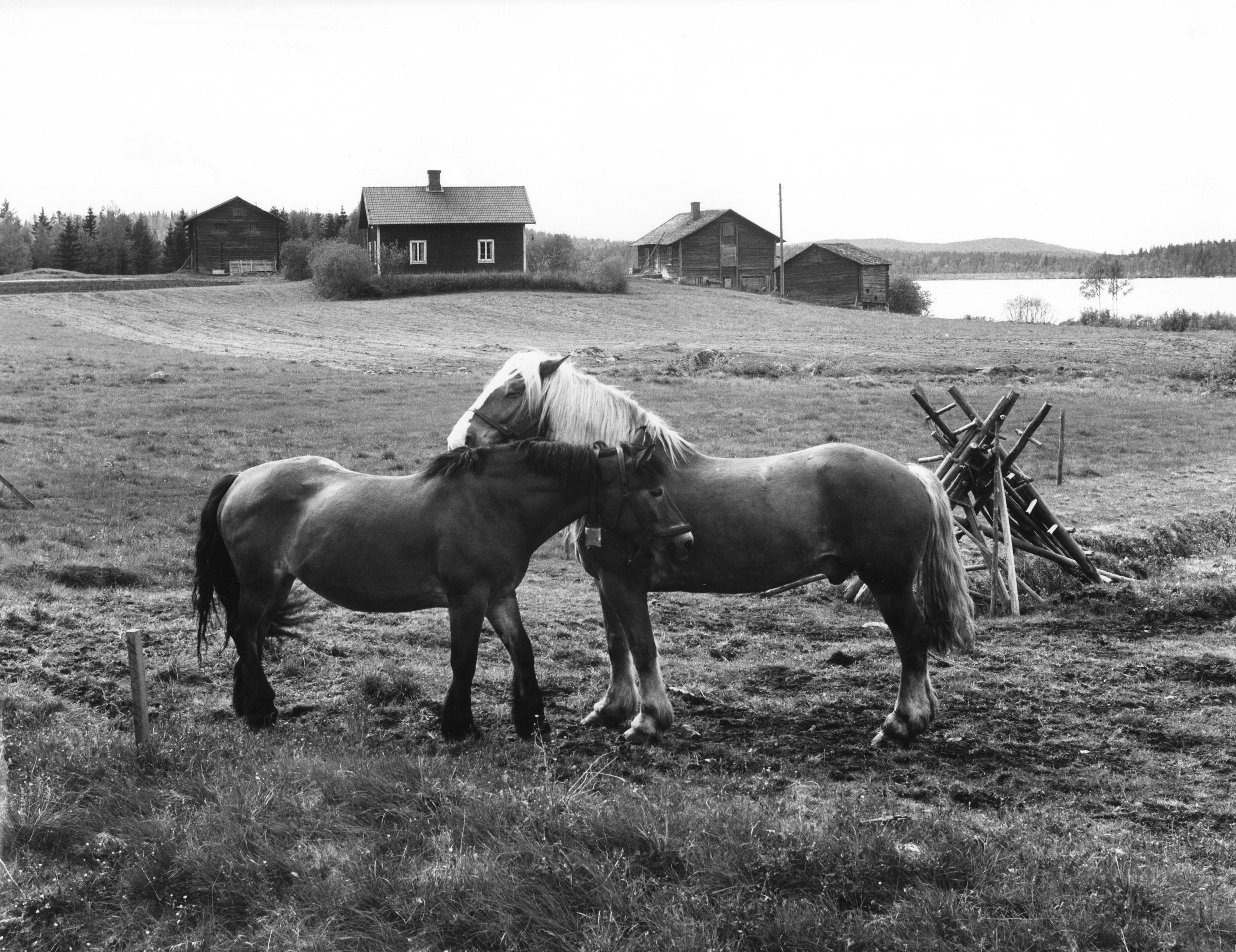 Hästar i hage. Bilden troligen från början av 1960-talet.
