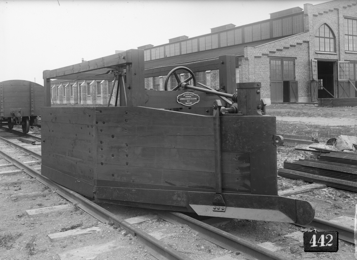 Norsholm - Västervik - Hultsfreds Järnvägar, NVHJ vingplog. I bakgrunden det ursprungliga plåtslageriet. Aktiebolaget Svenska Järnvägsverkstäderna, ASJ.