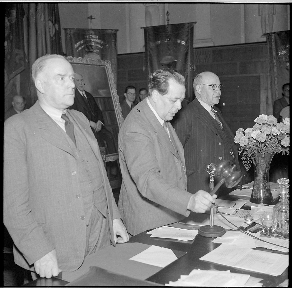 Möte i en samlingslokal. Mannen längst till höger ses avporträtterad på tavlan baktill.