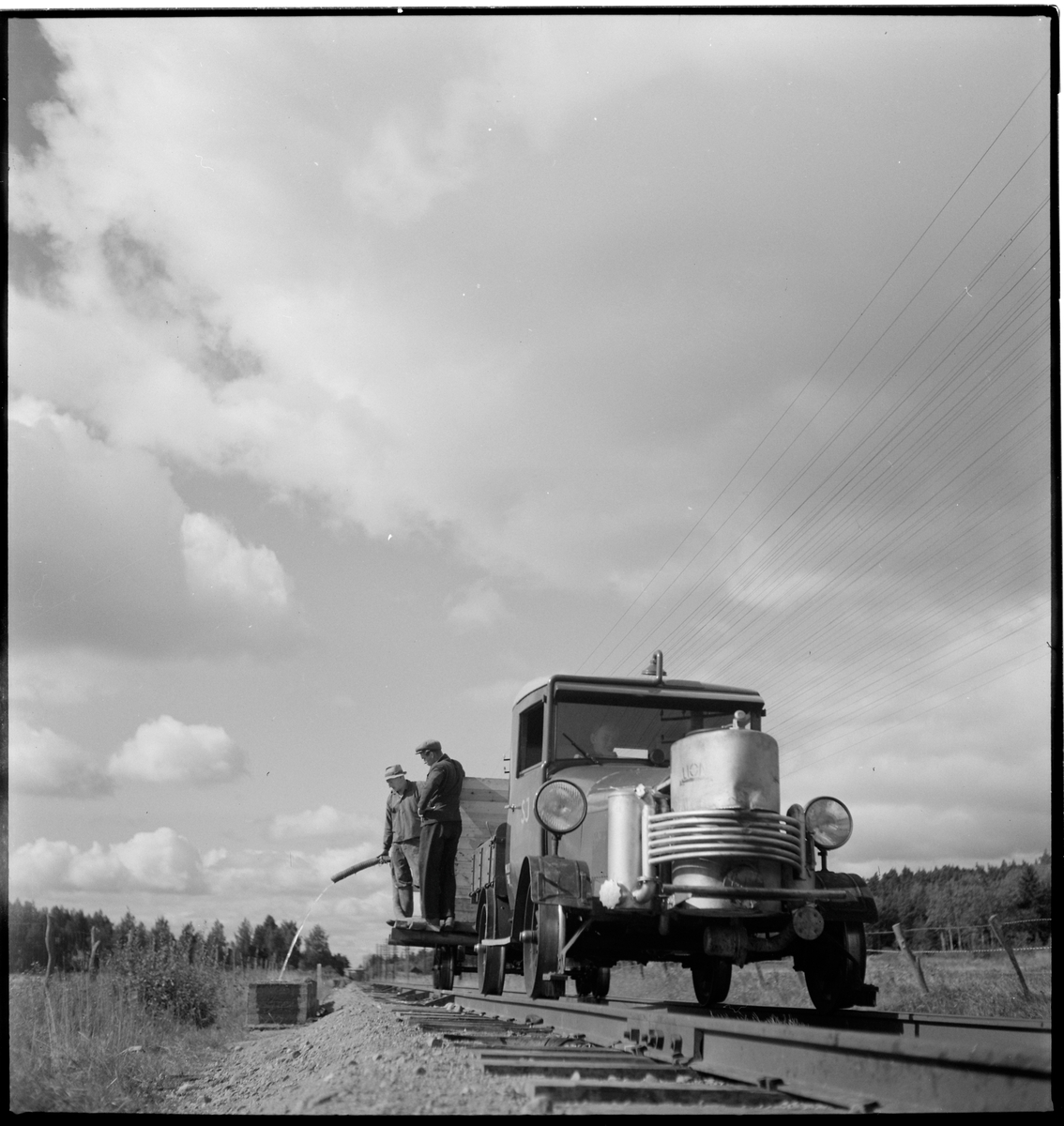 Vattning av gjutform till stolpfundament, vid elektrifieringen av linjen Östersund-Storlien.