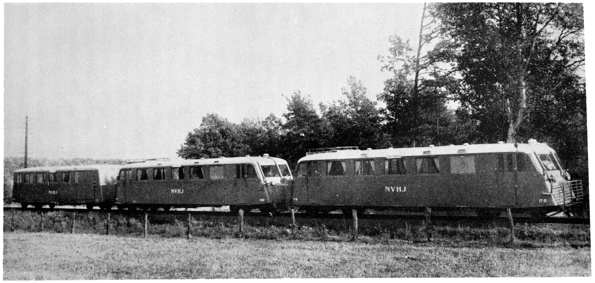 Rälsbusståg på linjen mellan Västervik och Jenny. Norsholm - Västervik - Hultsfreds Järnvägar, NVHJ Y0 17, NVHJ Y0 20 och NVHJ UCF0 181.