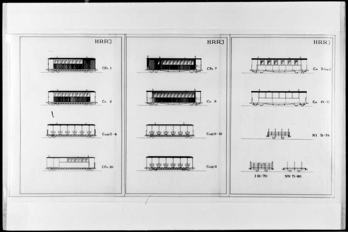 Tecknade bilder på Helsingborg–Råå–Ramlösa järnväg, HRRJ personvagnar, personvagnar (sommar) och öppna godsvagnar.