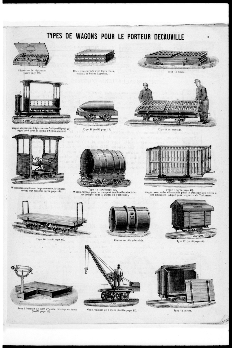På bilden syns lätt monterbara vagntyper för användning på Décauvillejärnväg. Décauvillejärnväg var ett system för lätt flyttbar smalspårjärnväg.