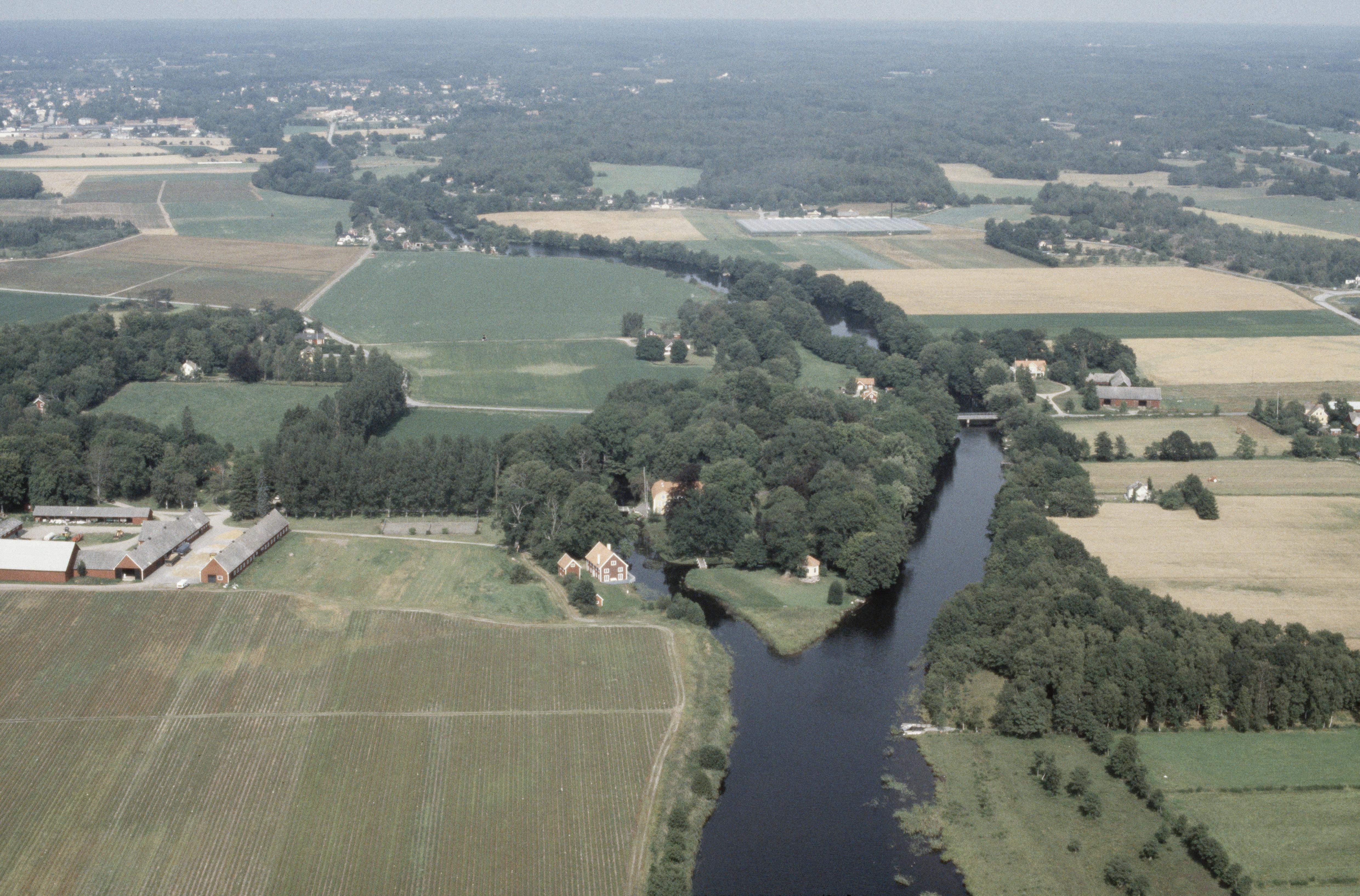 Mörrumsån vid Elleholms hovgård / herrgård och Elleholms kyrka (skymd bland träden till höger). Fornlämningsområde med bl.a. stadslager RAÄnr Elleholm 12:1. Bilden är tagen mot (väderstreck): NNO