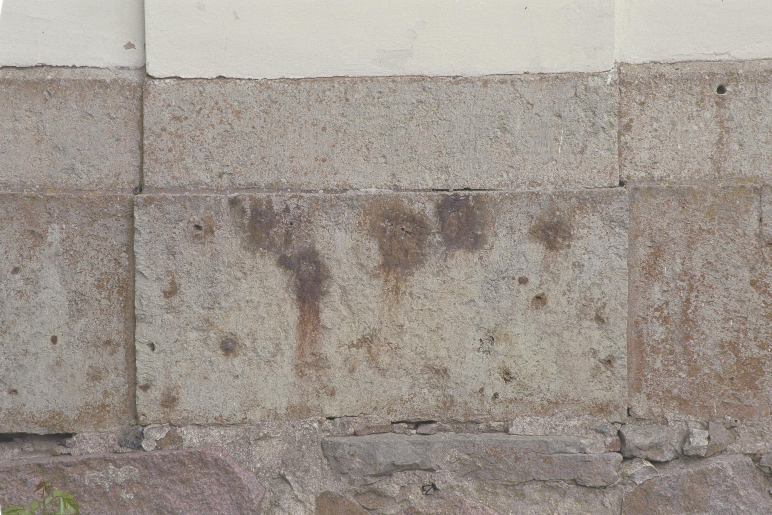 Huvudbyggnadens östra fasad, sockeln vid andra lisenen från vänster.
