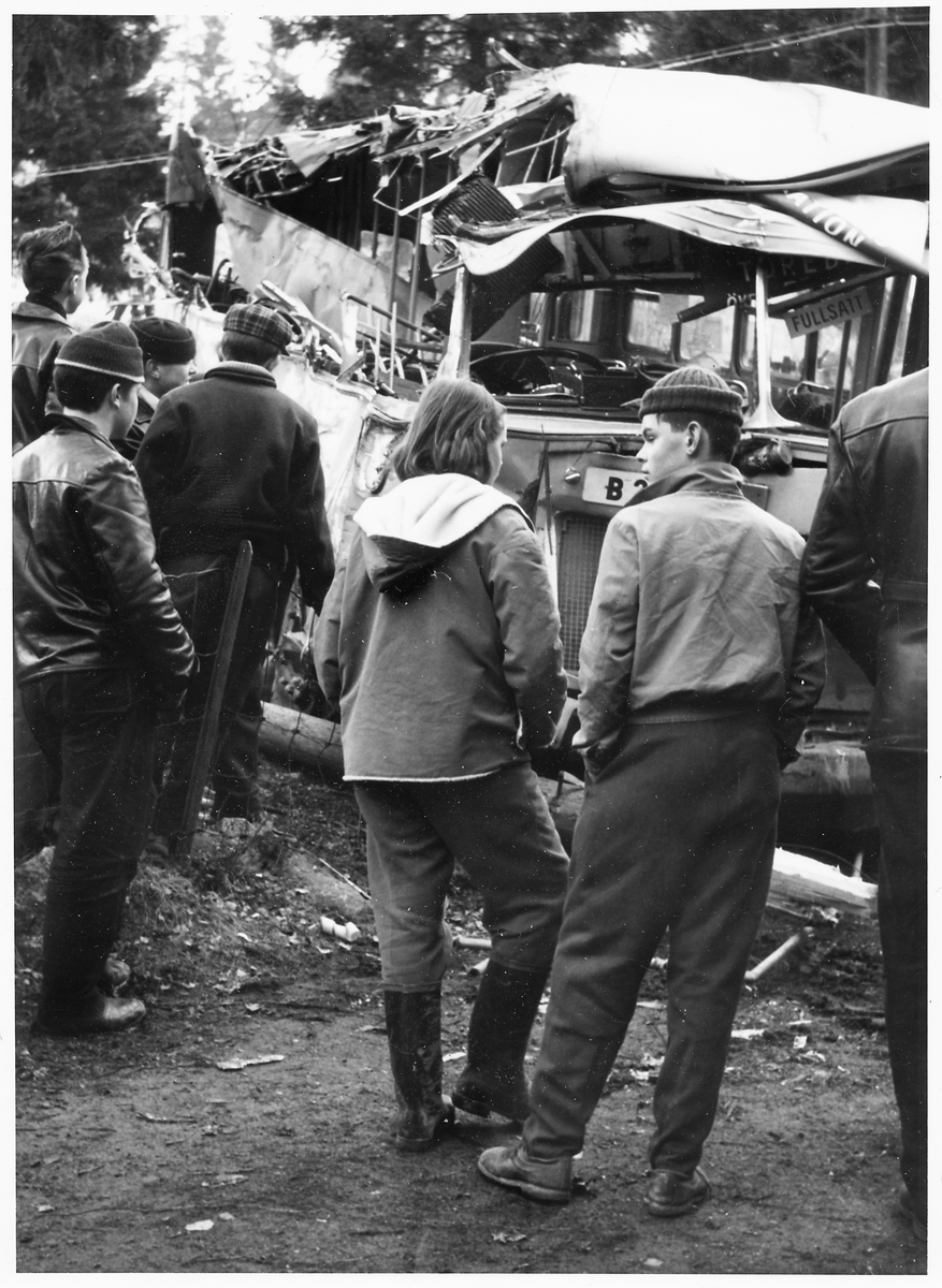Statens Järnvägar, SJ buss 2496 efter trafikolycka i Solna 1957.