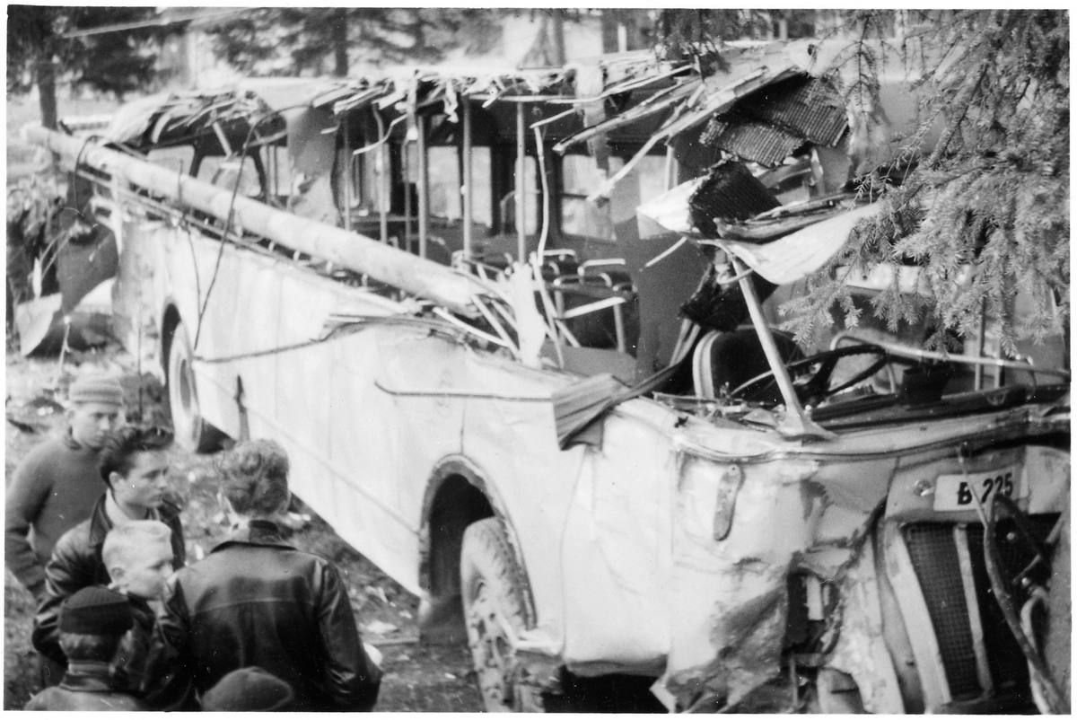 Statens Järnvägar, SJ buss 2496 efter trafikolycka i Solna 1957.