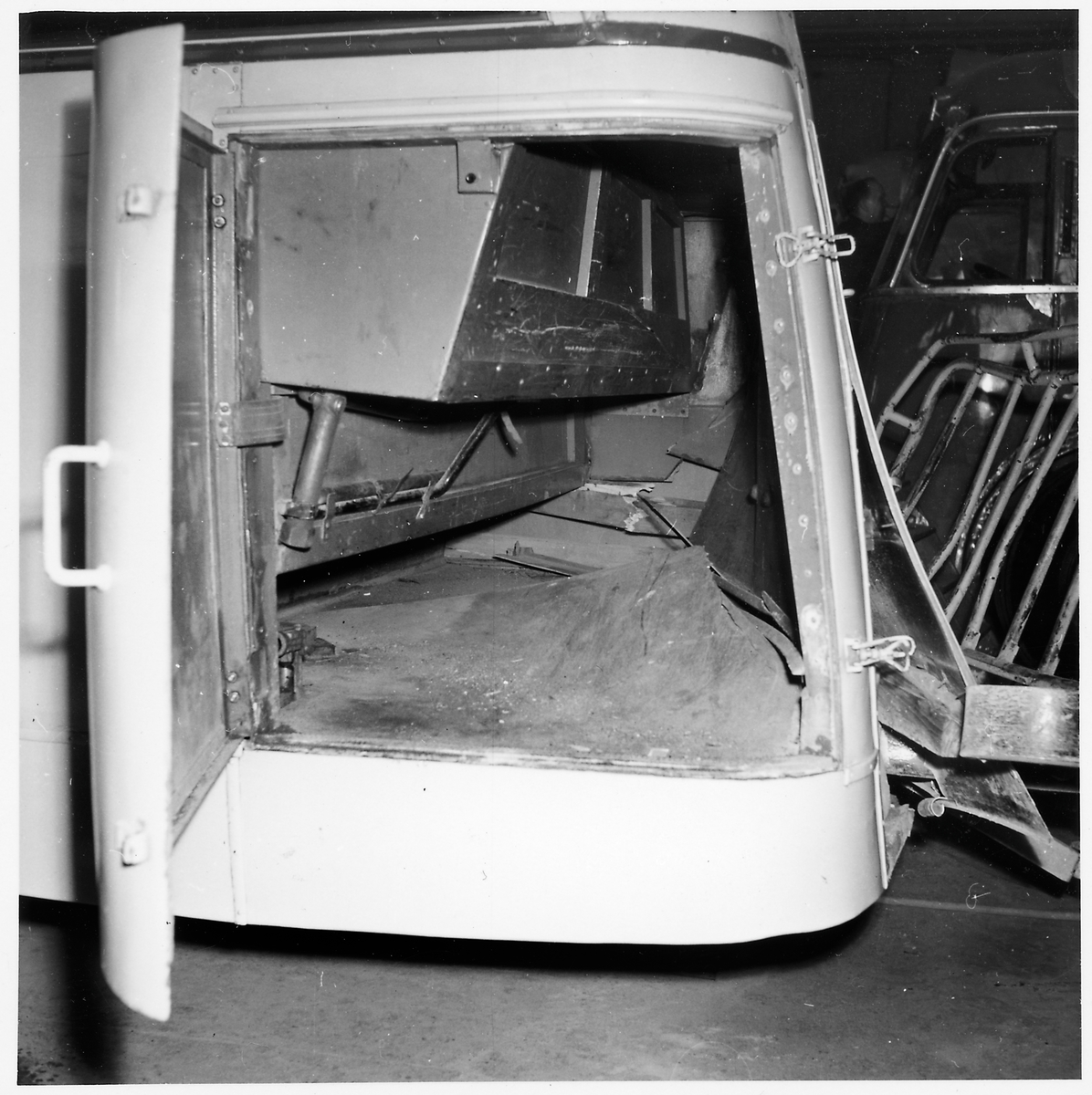 Detaljer på krockskadade bussen, Statens Järnvägars, SJ buss 1234.
