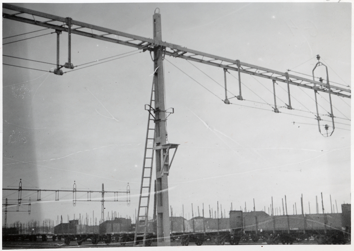 Titel: Elarbete och kontaktledningsbrygga på bangården.