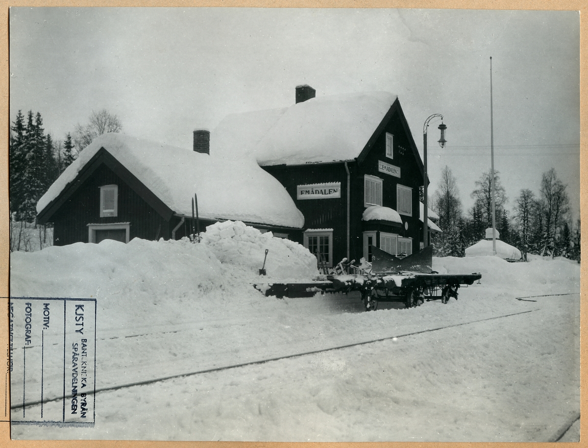 Snöröjning vid Emådalen Station. Plogvinge på godsvagn.