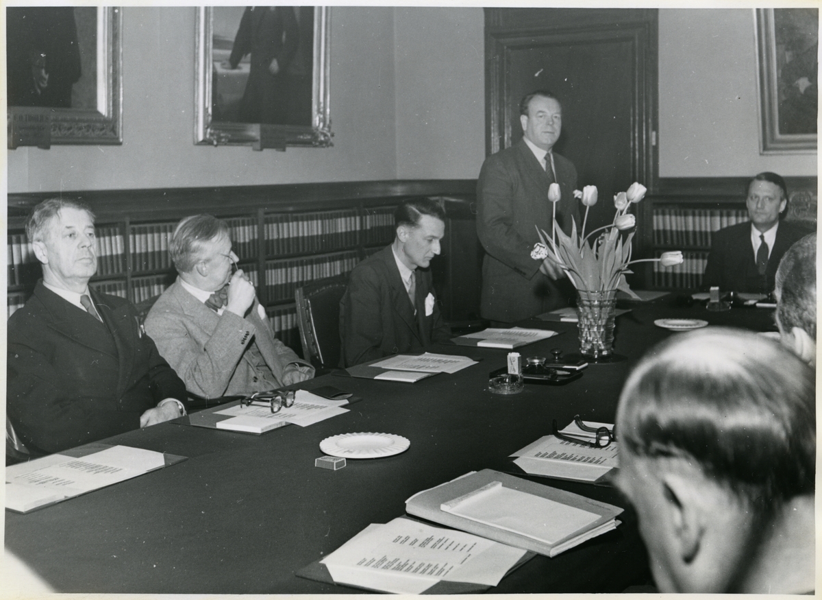 Generaldirektör H. E. Stokke stående till vänster Generaldirektör Erik Upmark, NSB, vid första besöket i järnvägstyrelsen, våren 1951.