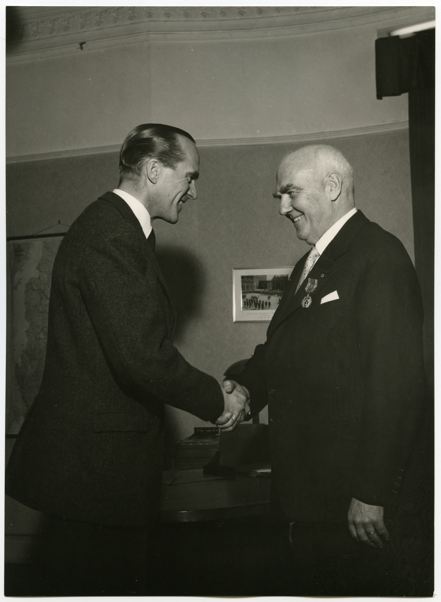 Distriktschef R Markland Malmö avtackas i plenisalen och på Försvarsbyrån, Stockholm 1956 12 28.