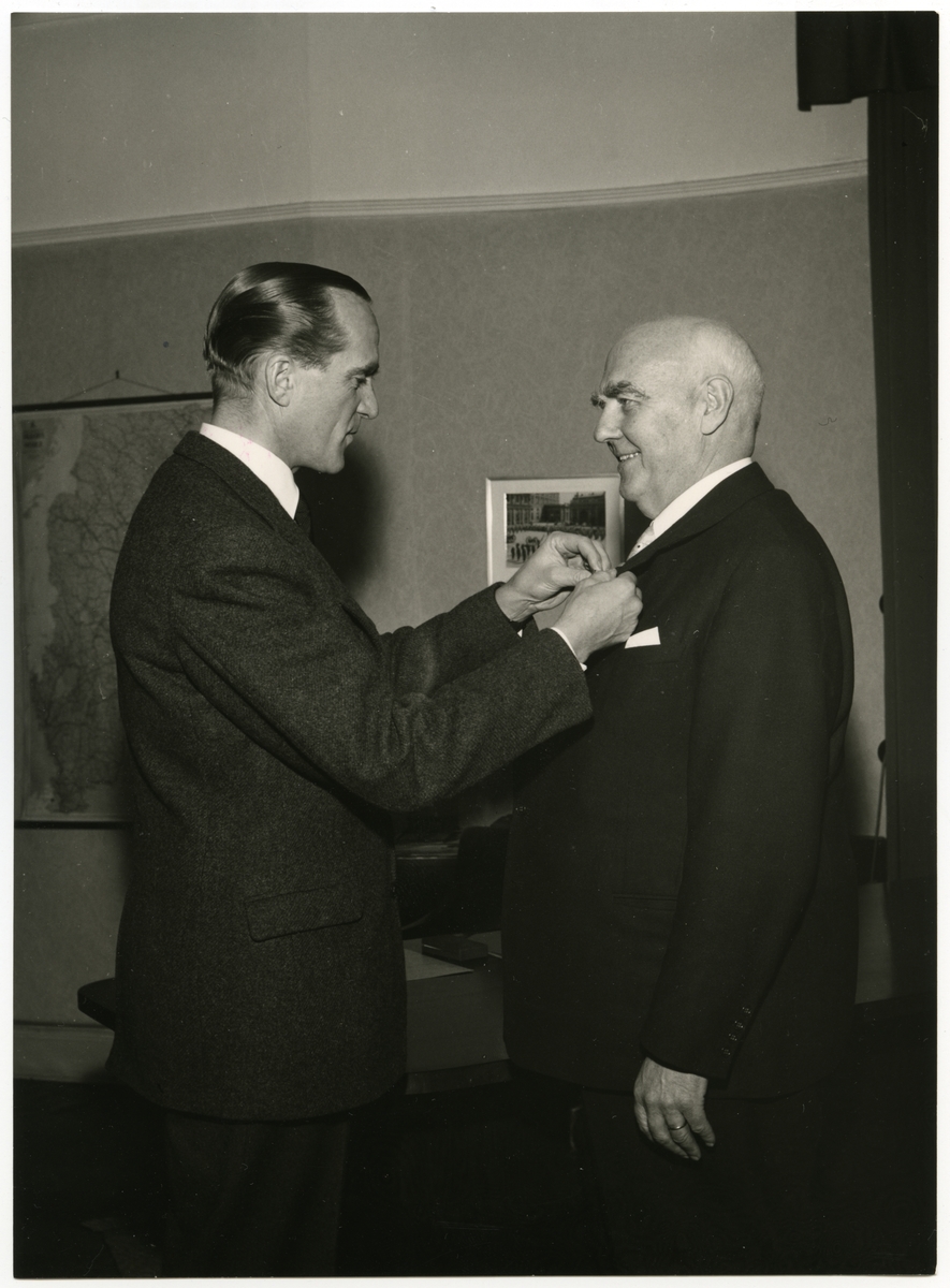 Distriktschef R Markland Malmö avtackas i plenisalen och på Försvarsbyrån, Stockholm 1956 12 28.