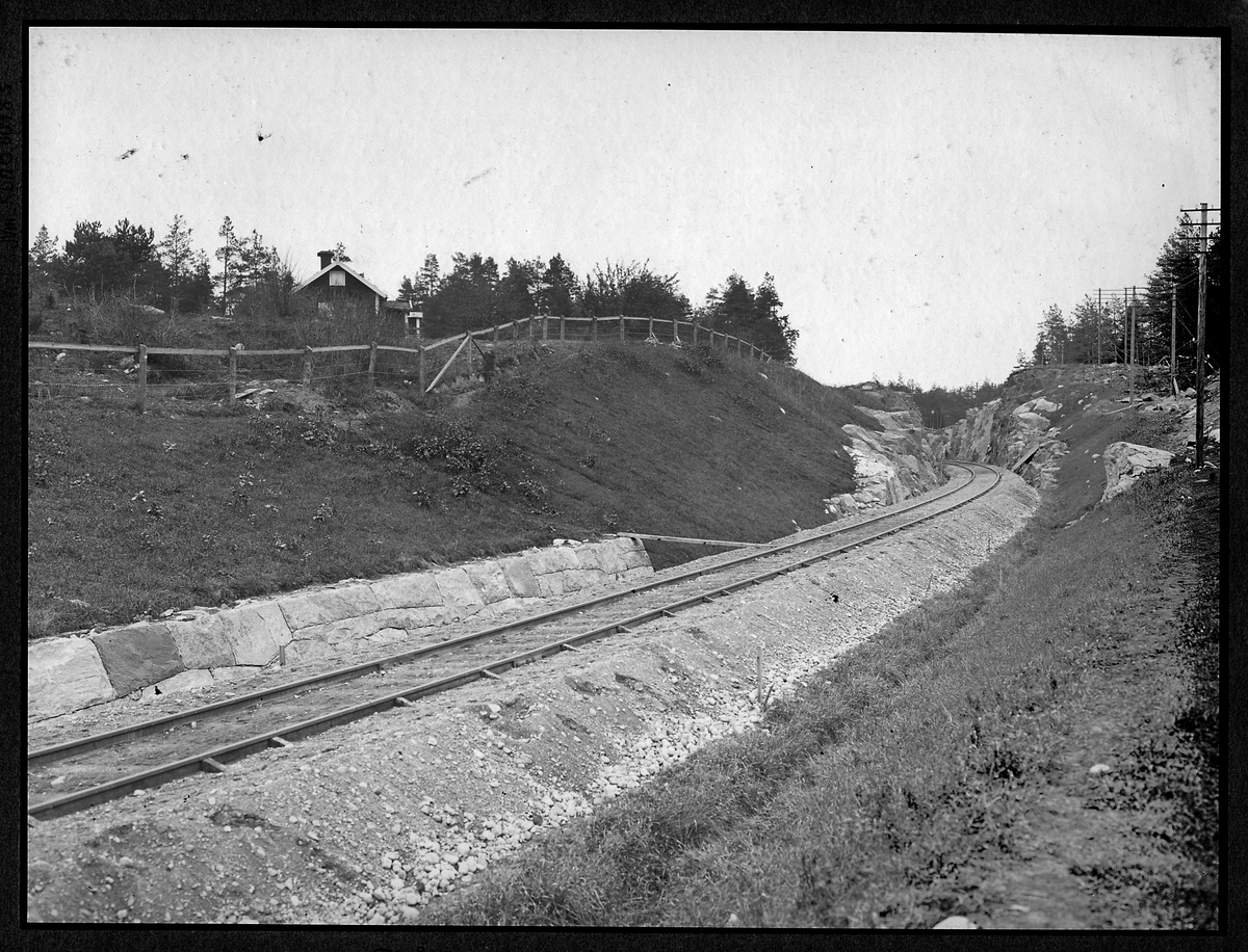 Skårbyskärningen med stödjemur vid 16,7 kilometer strax norr om Vagnhärad. Statsbanan Järna - Norrköping.