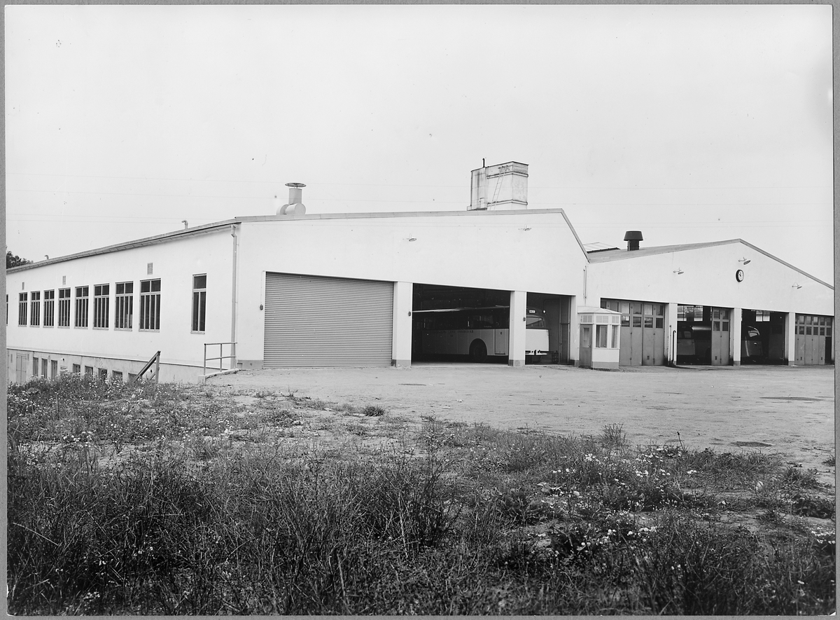 Bussgaraget i Enebyberg. Stockholms Läns Omnibuss AB, SLO (Stockholm-Roslagens Järnväg, SRJ).
