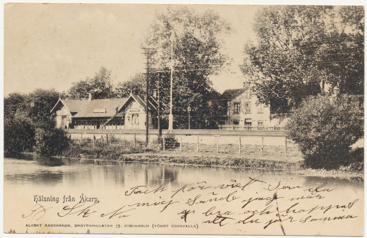 Järnvägsstationen i Åkarp med en damm i förgrunden.