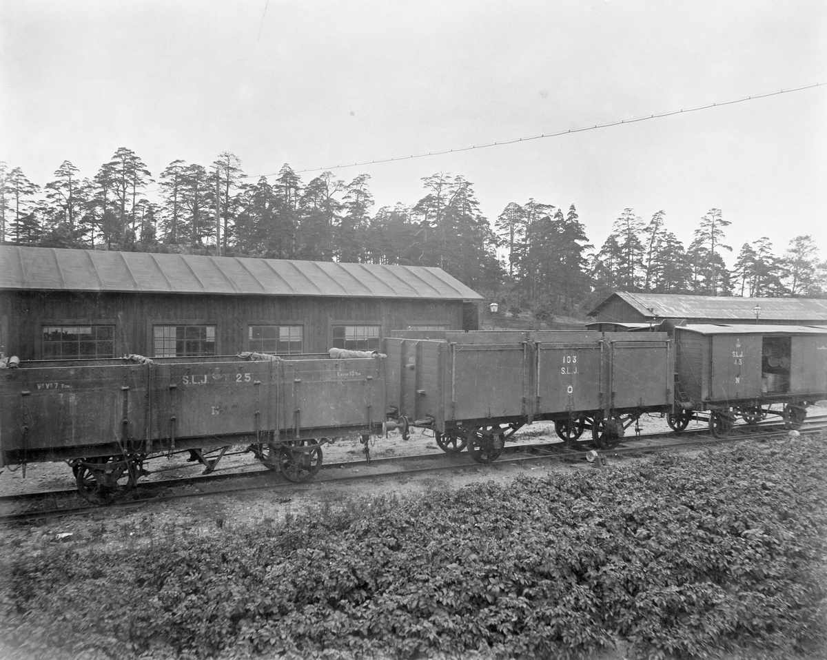 SLJ godsvagn 25, SLJ godsvagn 103, SLJ godsvagn 45. Spånga - Lövsta Järnväg, Norra Renhålln. stn